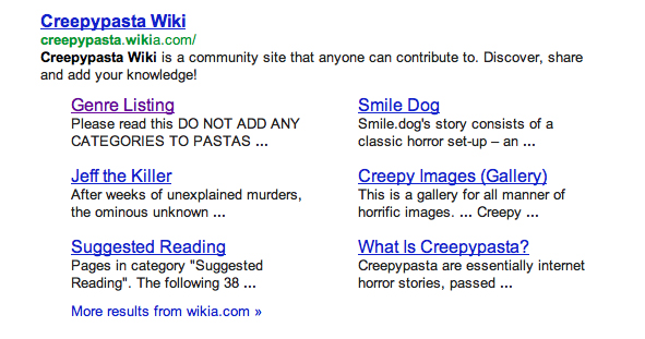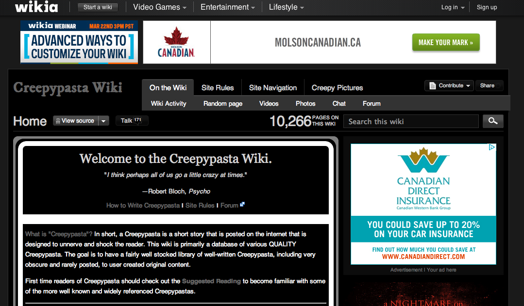 This site is based apon the internet phenomena that that is the Creepypasta. A scary story circulating around the internet. the Creepypastawiki these entries are organized into easy to access genre's that include images, short stories,and these unto various sub categorizes. This increasingly specific branches of the pasta tree allow for a fun, user friendly experience. The pasta's are generally targeted at the younger tech savy generation, with many references to urban myths present. Pasta's are collected from all corners of the internet. stories from 4chan's paranormal board, to warcraft's chat rooms are featured. There are also some copyright questionable books from H.P Lovcraftt, and other authors. Proper citation is always an important issue, and discussion board's for questionable pasta's are present. Most of the content is of a extremely high quality with bad pasta's usually being deleted, or politely put into the troll catagory.